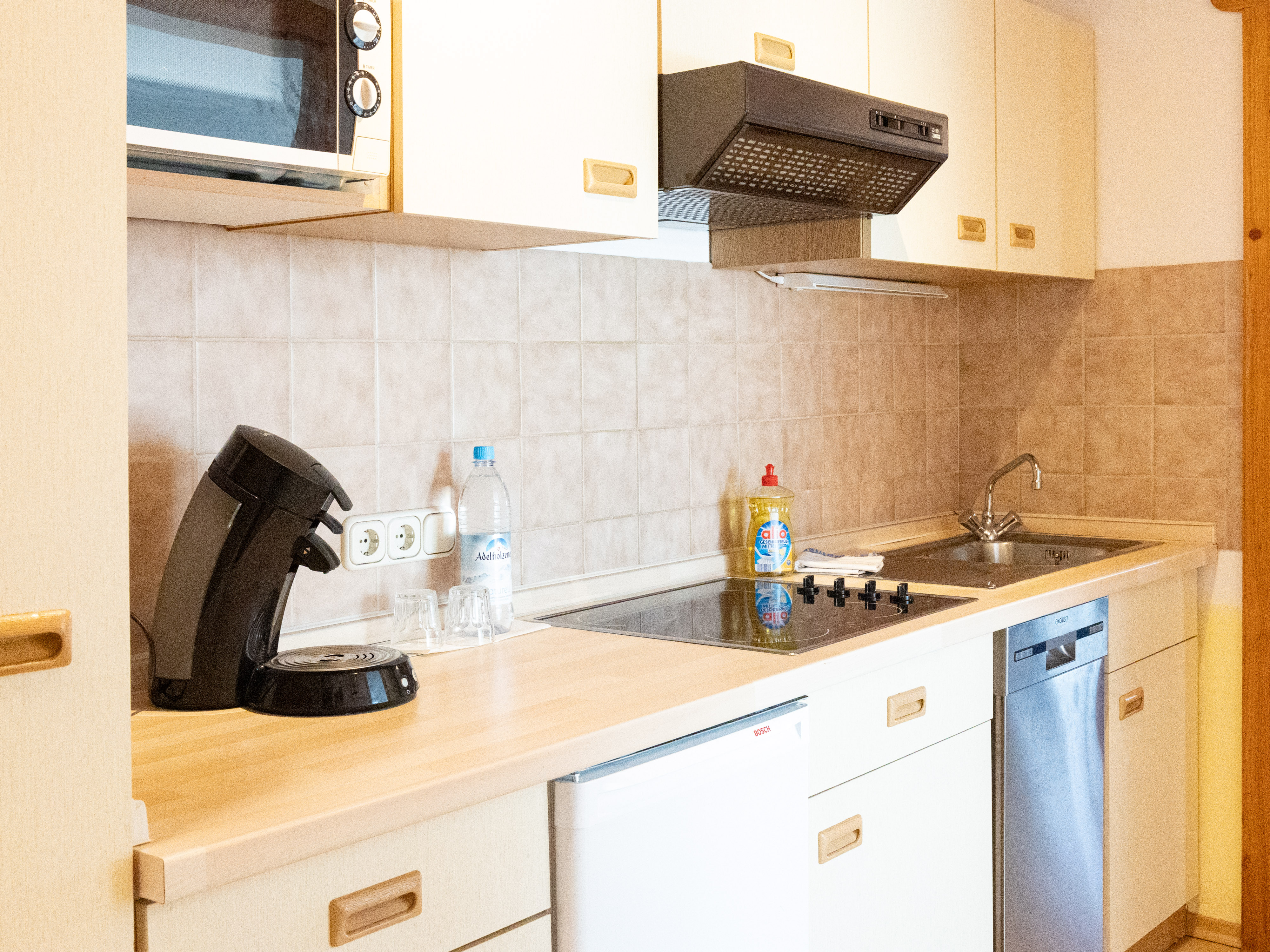 Kühlschrank mit einem Gefrierfach, Cerankochfeld, Filterkaffeemaschine, Geschirrspüler, Mobiler Minibackofen, Mikrowelle, Toaster, Wasserkocher