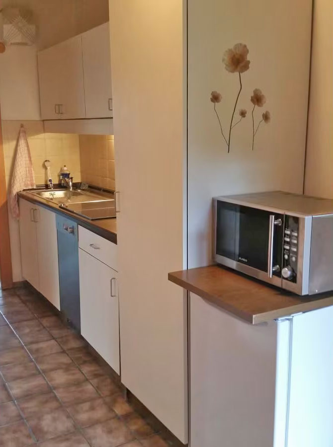 Die kompakte Küchenzeile ist mit Cerankochfeld, Spülmaschine, Mikrowellen-Grill-Back-Kombi, Kühlschrank, Kaffeemaschine, Wasserkocher und Toaster vollständig ausgestattet. Das Bad verfügt über Dusche und WC.