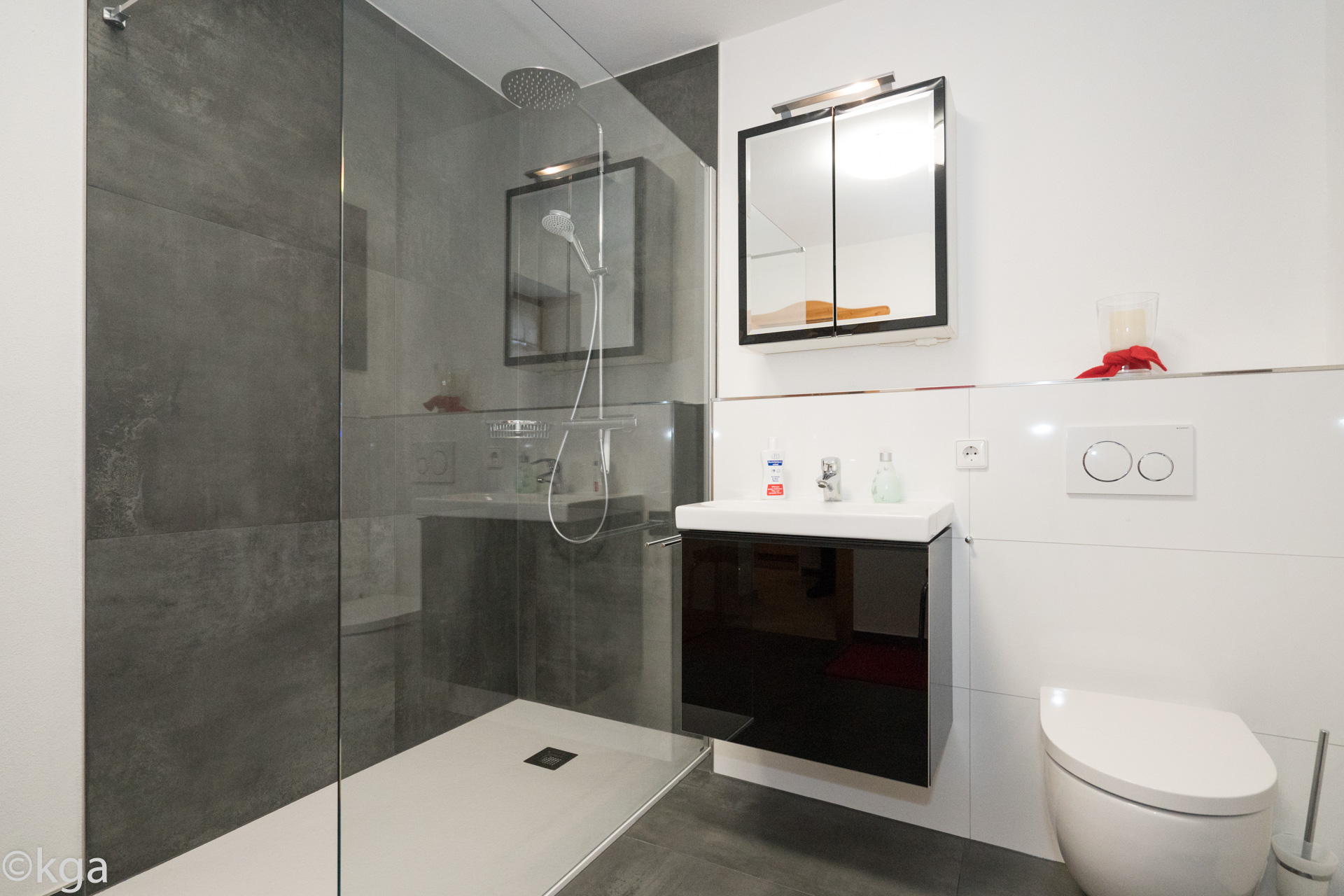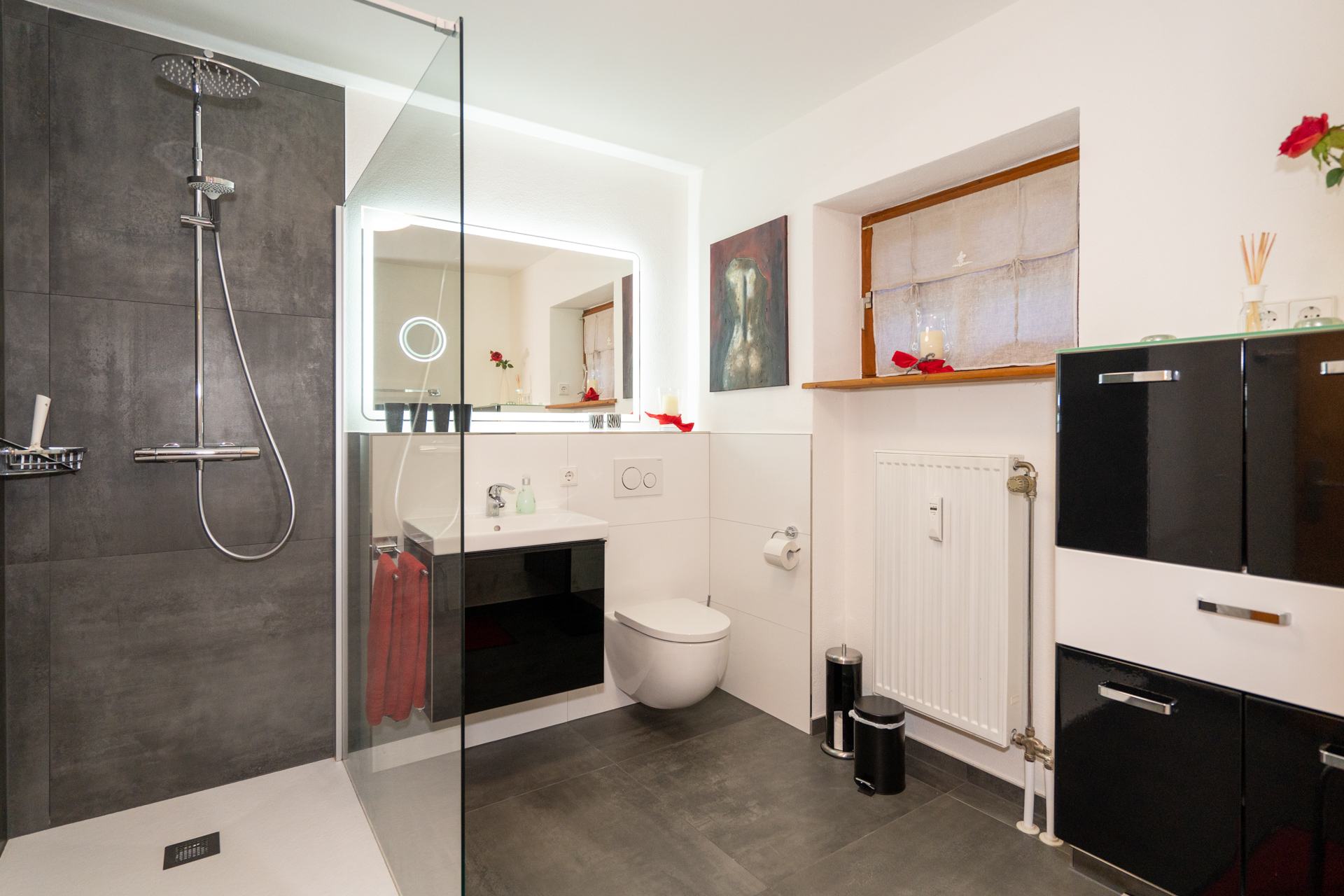 Ein Highlight ist das große Badezimmer mit begehbarer Regendusche, WC und großem Badezimmerschrank.