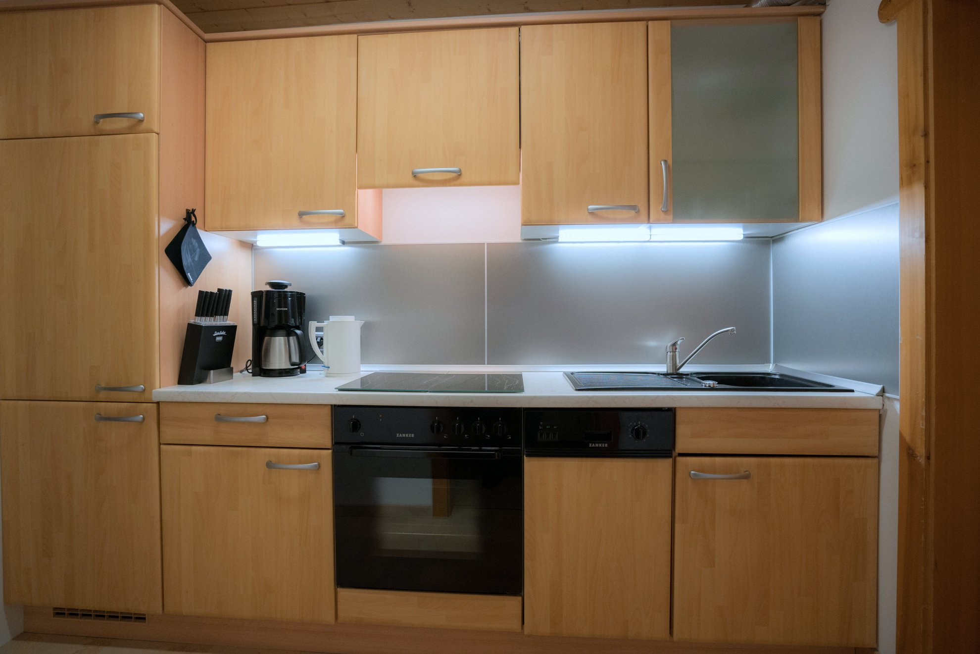 Die Ausstattung ist ideal für Familien: Waschmaschine, Trockner und Kühlschrank eine zusätzliche Kühl-Gefrierkombination sowie eine Spülmaschine sind vorhanden. Die moderne Küche verfügt über Ceranfeld und Backofen, viele Küchengeräte und eine Mikrowelle.